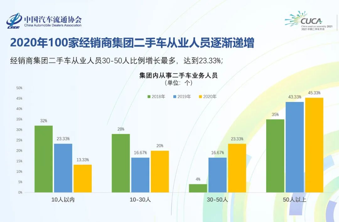 从近三年100家经销商集团二手车从业人员的变化情况可见,经销商集团二手车从业人员30~50人比例增长最多,达到23.33%,而从业人员10人以内和10~30人都出现了下降。