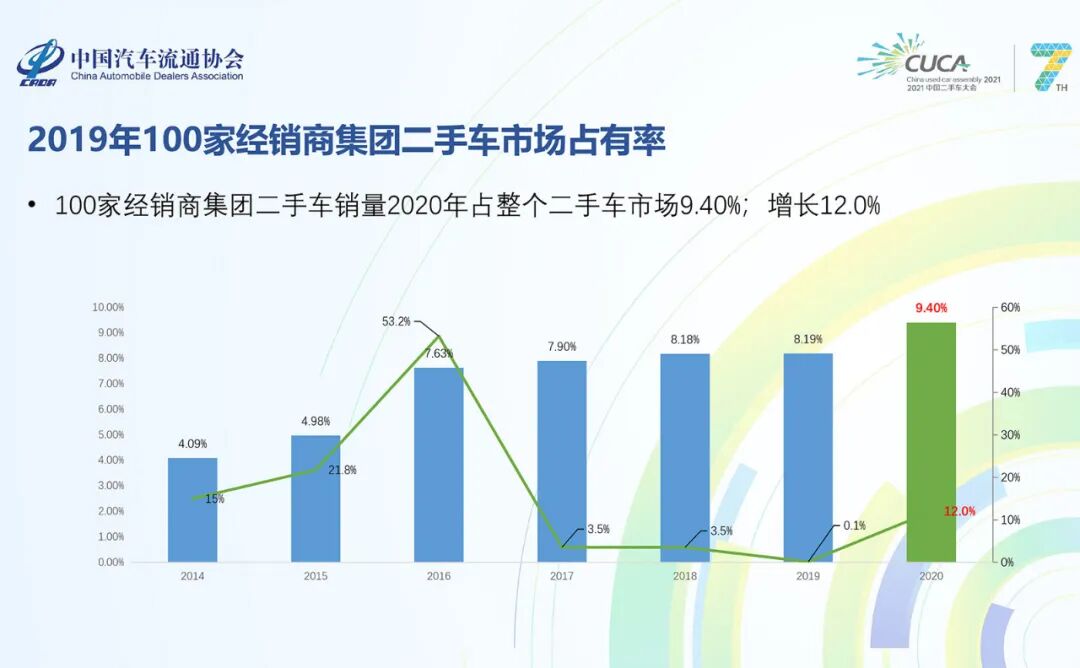中国100家经销商集团二手车销量占2020年二手车市场的总占比是9.40%,同比2019年的8.19%增长了12%。经销商集团二手车业务在整个二手车市场的占比幅度在逐渐提高,其中2020年的增速为2015年之后最高。