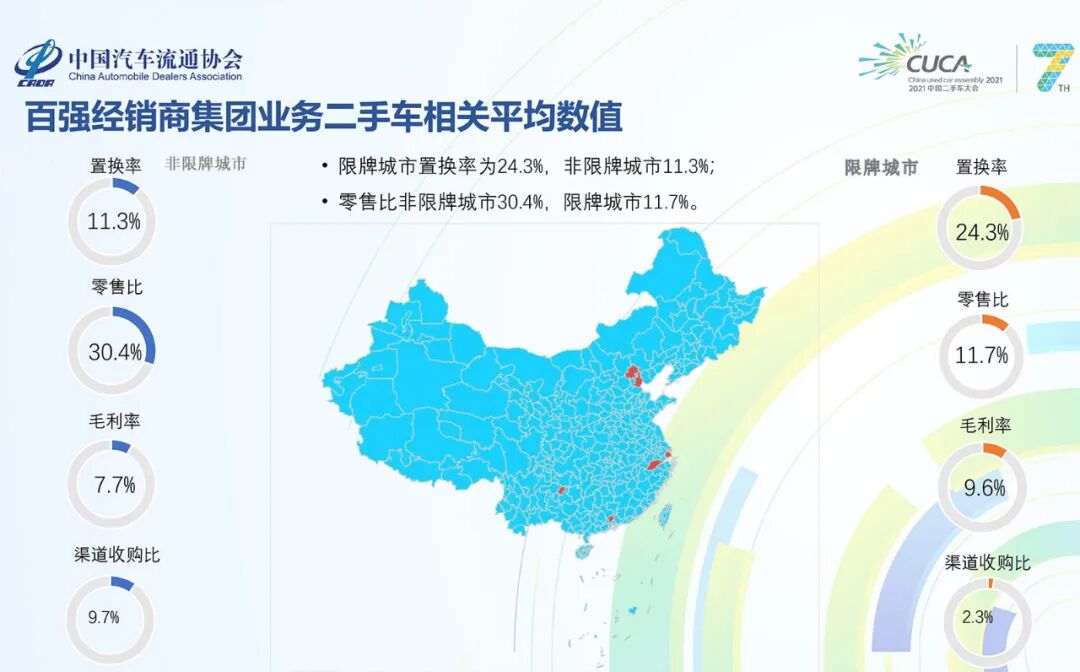 本次调查分别针对限牌城市和非限牌城市进行了数据采集。2020年的数据显示,限牌城市的置换率为24.3%,远高于非限牌城市的11.3%。限购城市的二手车毛利率为9.6%,高于非限购城市的7.7%。