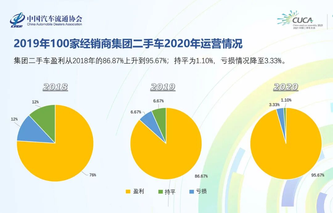 目前可见的是,经销商集团二手车业务大都在盈利,盈利的占比在逐年提高,2018年时,经销商集团二手车业务亏损的占比为12%,到2020年,亏损的占比仅为3.33%。
