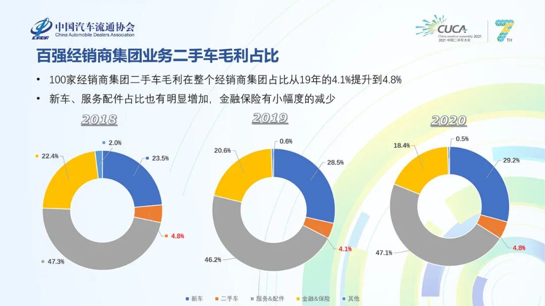 2020年,100家经销商集团二手车毛利在整个经销商集团中的占比从2019年的4.1%提升到4.8%,新车、服务配件的毛利占比也有明显提升,金融保险的毛利占比有小幅度的减少。