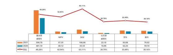 2021年1-7月全国累计交易二手车989.33万辆,同比增长45.96%。其中,基本型乘用车共交易598.78万辆,同比增长49.28%;SUV共交易106.90万辆,同比增长63.11%;MPV共交易57.35万辆,同比增长42.94% ;交叉型乘用车共交易22.18万辆,同比增长30.79%;
