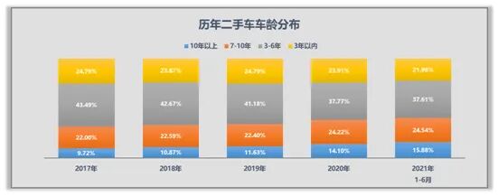 车龄在7-10年的车型占比相比去年增长了0.08百分点,共交易了242.75万辆。车龄在10年以上的车型占比与去年同期相比增长了1.68个百分点,共实现了157.06万辆的交易。