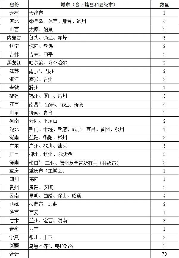 备注:表中标注“*”的南京、南昌、海口、乌鲁木齐为第一批已经试点城市