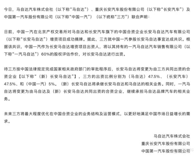 8月24日,马自达汽车、长安汽车以及中国一汽就长安马自达收购一汽马自达销售公司一事,发布了联合声明。原文如下: