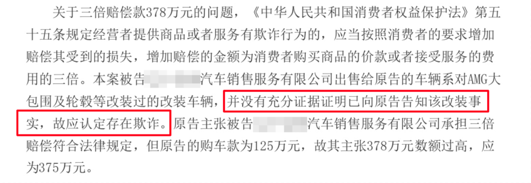 也就是说,消费者不知道这是非原厂件,配置是改装的,销售者的行为就是属于欺诈。退一赔三符合法律规定。