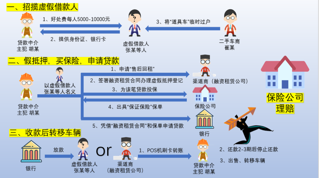经查,自2017年以来,以胡某、吴某、王某、丁某等人为首的多个犯罪团伙为牟取非法利益,通过互联网招揽了近百名像张某这样的虚假借款人,而后伙同个别二手车商、金融机构员工,通过伪造机动车抵押登记记录,伪造房产证、不动产抵押登记证明,临时过户他人寿险保单等方式,虚增虚假借款人的信用资质,并以虚假借款人名义投保个人履约、信用保证险,进而向金融机构申请办理贷款。