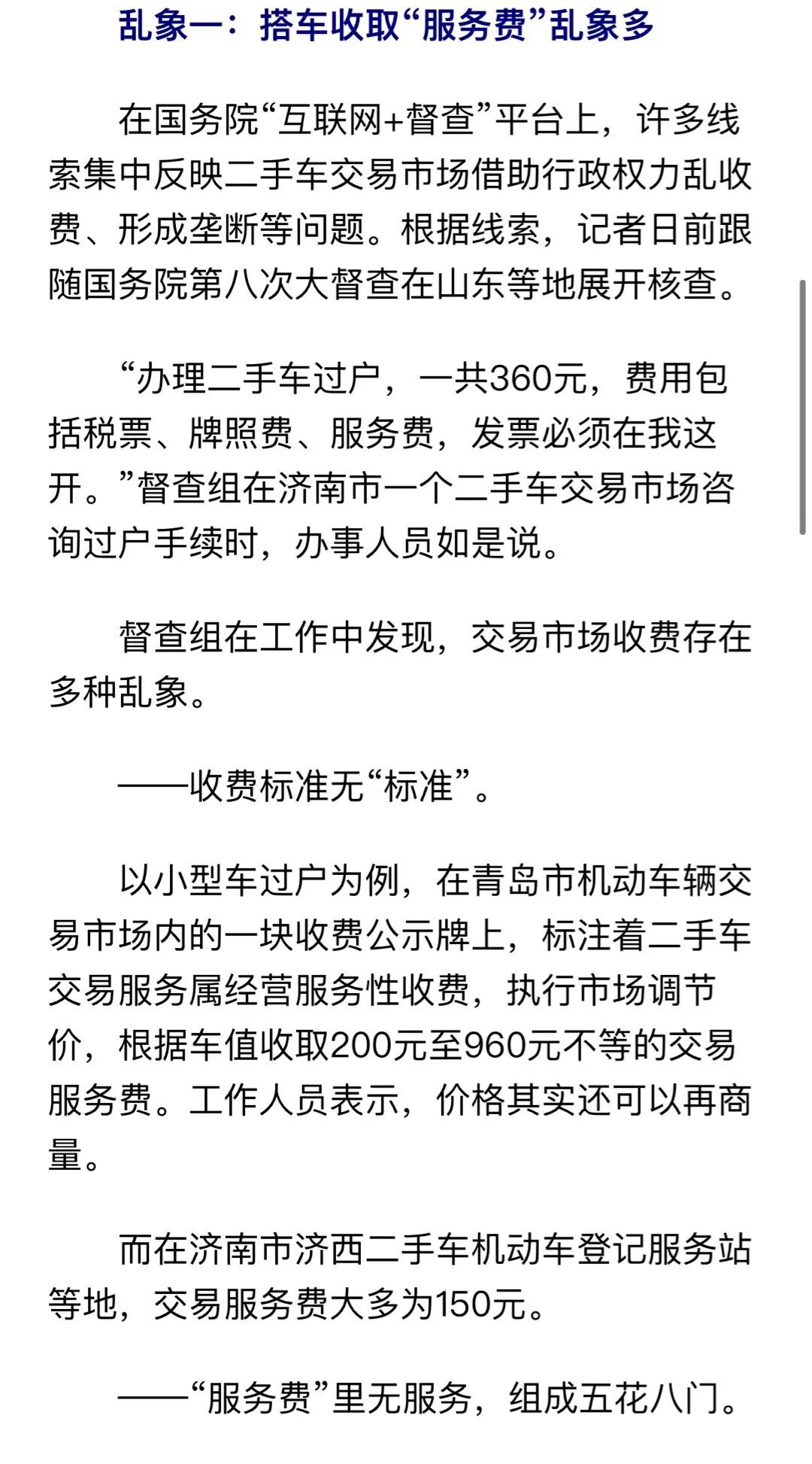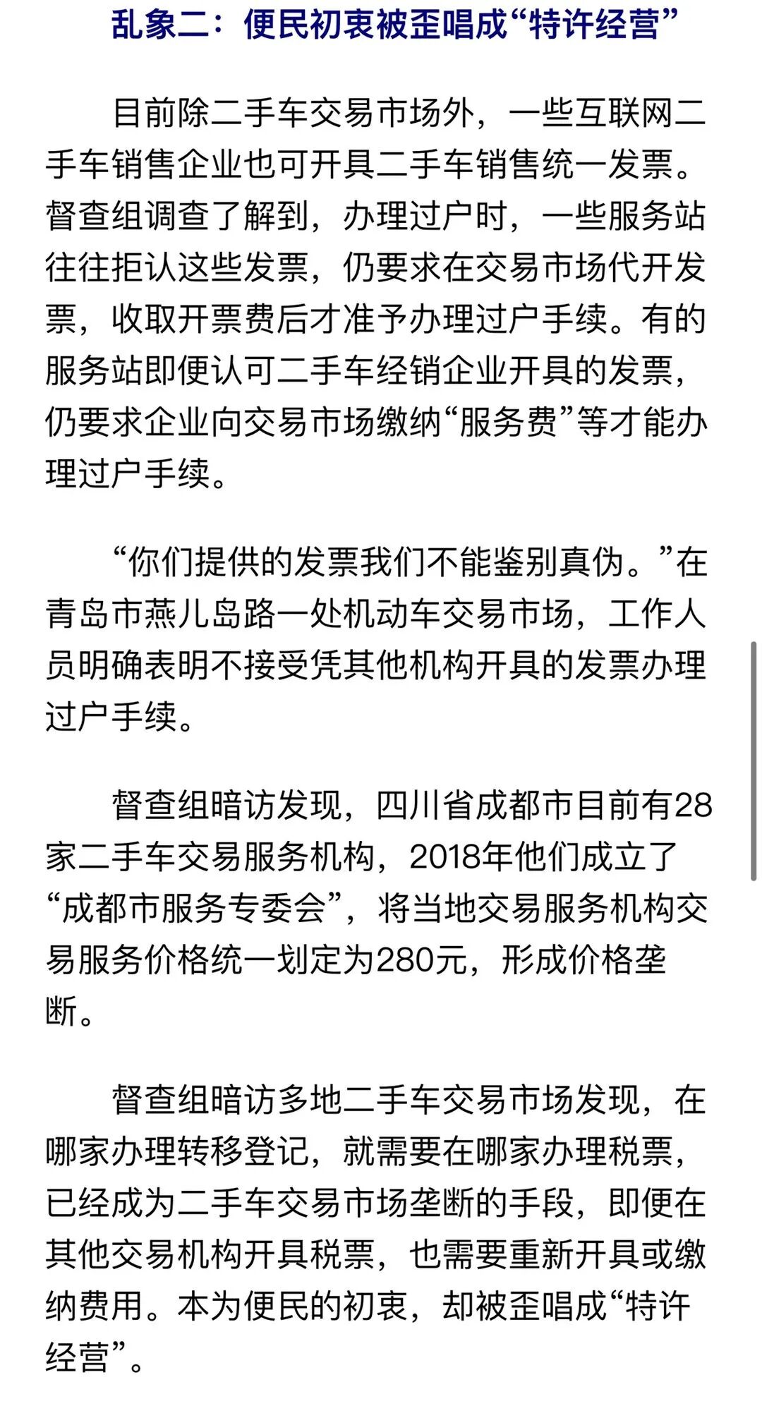 然而,国务院第八次大督查对国务院“互联网+督查”平台反映的线索进行核实后却发现,有的交易市场凭借这些行政权力,向办理相关业务的个人、商户捆绑名目繁多的“增值服务费”,形成垄断。