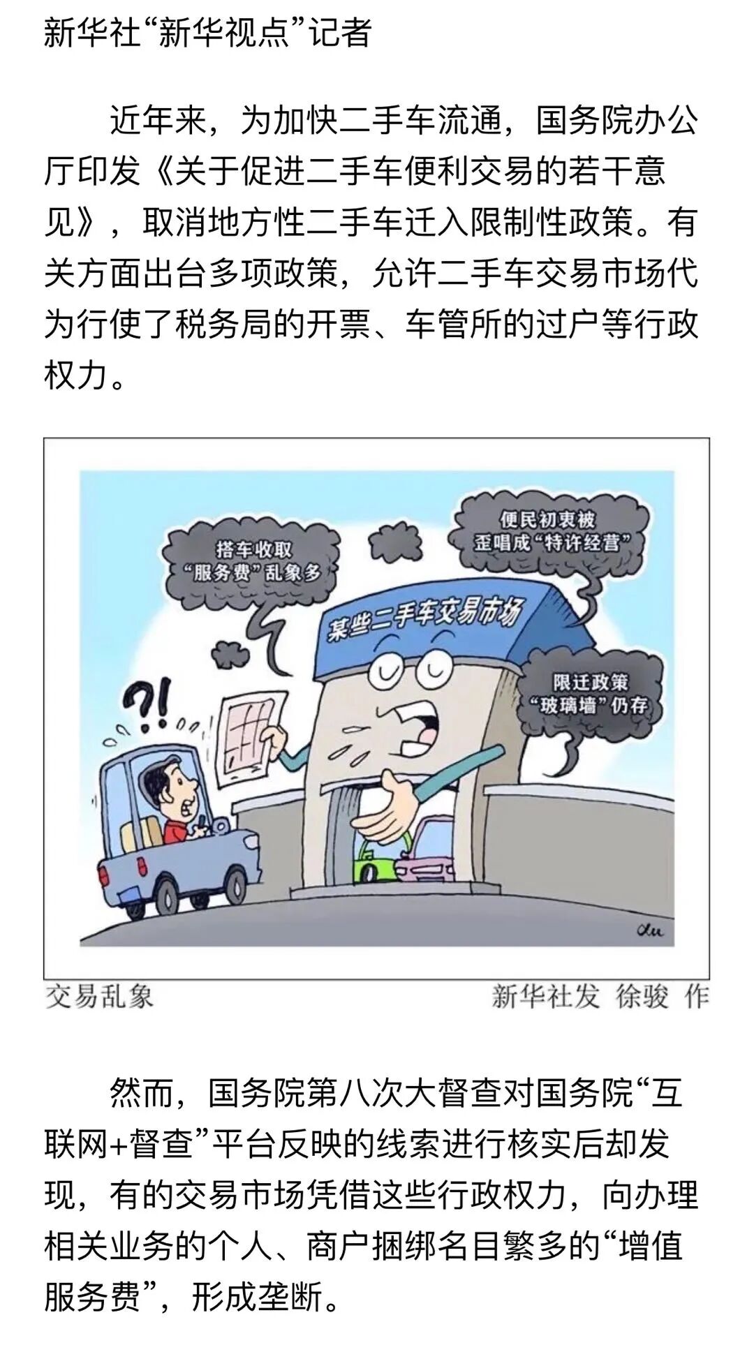 有关方面出台多项政策,允许二手车交易市场代为行使了税务局的开票、车管所的过户等行政权力。