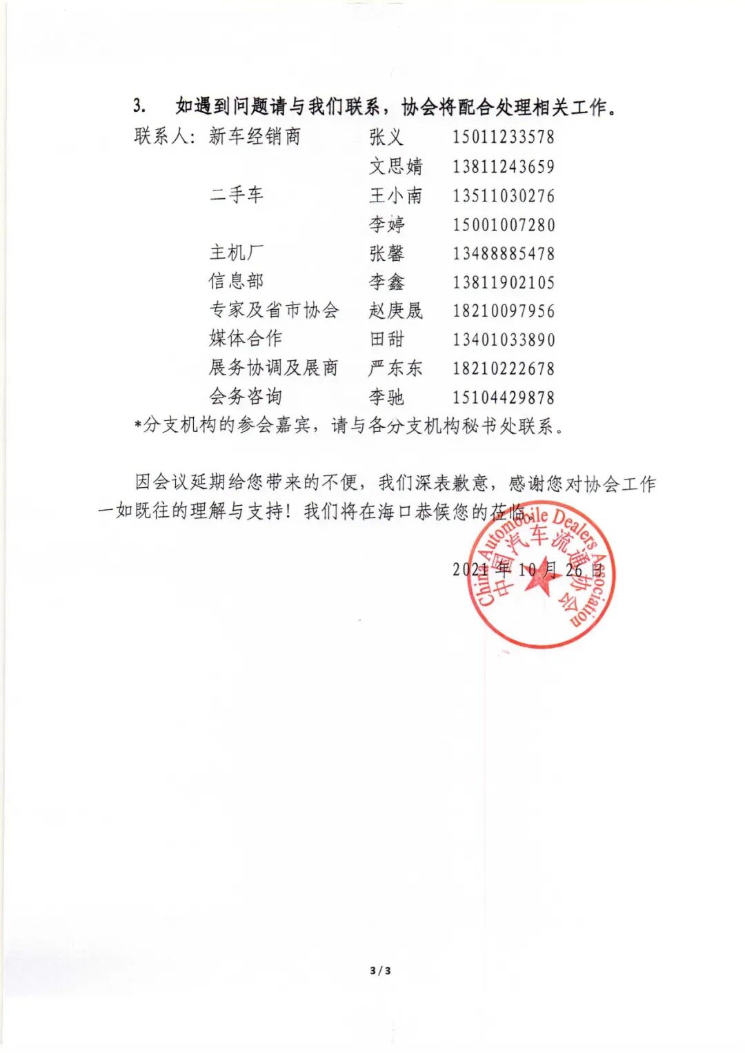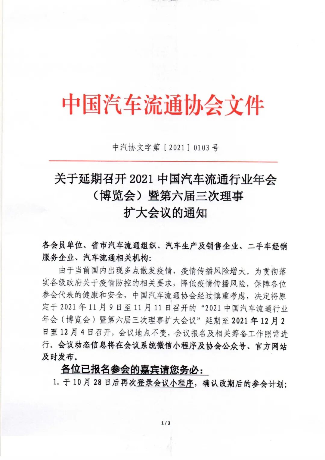 中国汽车流通协会经过慎重考虑,决定将原定于 2021年11月9日至11月11日召开的“2021中国汽车流通行业年会(博览会)暨第六届三次理事扩大会议”延期至 2021年12月2日至 12月4日召开,会议地点不变,会议报名及相关筹备工作照常进行。