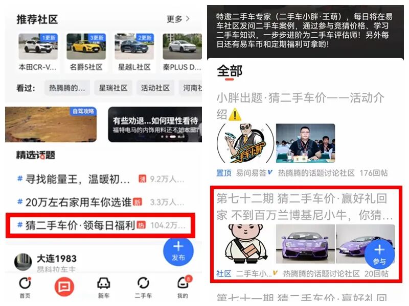 每天来易车社群,和小胖个PK二手车猜价格,赢了有车模儿,输了也有欢乐,我和百万XDM等你来哦!