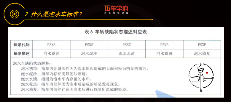 此外根据泡水车的损伤程度也进行了更为细致的界定,比如泡水锈蚀、泥沙、水渍、霉斑、修复,这些都对车辆外来的价值评定有着新的标准,其价值评估又会有明显差别,而不仅仅是“泡水车”三个字那么简单。
