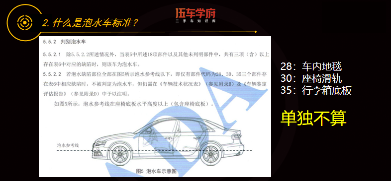 泡水车的判断增加了多项综合的要求,比如最常见的车内地毯、座椅导轨、行李箱底板要综合三项,如果是单独一项则不能判断是事故车,减少误判和过度贬值鉴定的问题。