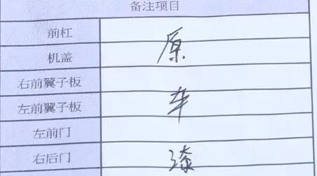 据车主张先生介绍,他买车的时候,平台跟他保证这辆二手车是“原版原漆没换过件”,交车单上也清楚的写着“原车漆”三个字。