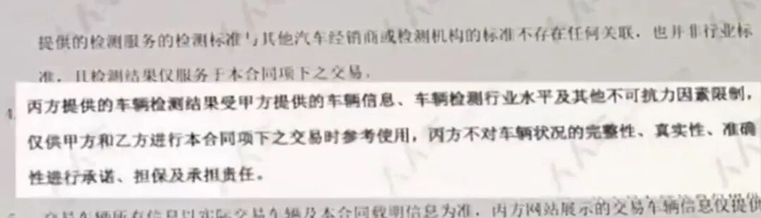 此外,人人车的工作人员还称,即便消费者买到了调表车,平台也没有责任,因为合同里写明了“免责条款”:丙方(人人车)不对车辆状况的完整性、真实性、准确性进行承诺、担保及承担责任。