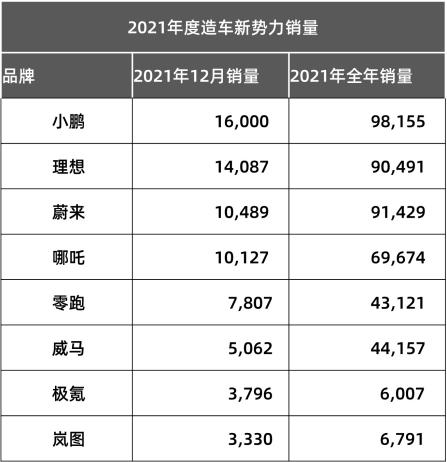 比亚迪公告,2021年全年新能源乘用车销量达59.37万辆,同比增长231.6%;造车新势力阵营中,小鹏汽车全年总交付量达到98155辆,同比增长超263%;蔚来汽车全年交付达91429辆,位居新势力第二;理想汽车2021全年总销量达到90491辆,同比增长177.4%;