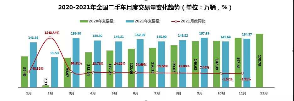 二手车方面,成绩更为显著:截止至2021年11月份,中国二手车交易量1596.68万辆。中国汽车流通协会预计,2021年全年二手车交易量将突破1700万至1750万辆,超过2019年的水平,增幅在20%以上。