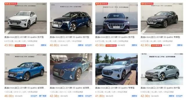 进口奥迪e-tron:新车54.68-64.88万,1-2年车龄二手车33-47万