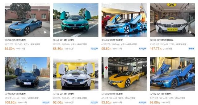 宝马i8:新车(停售)190-202万,2-6年车龄二手车75-140万