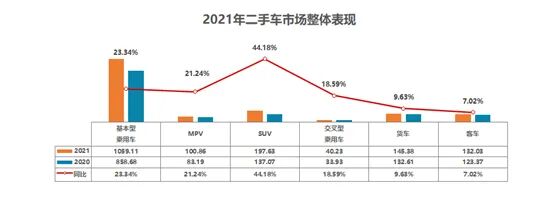 2021年全国累计交易二手车1758.51万辆,同比增长22.62%。其中,基本型乘用车共交易1059.11万辆,同比增长23.34%;SUV共交易197.63万辆,同比增长44.18%;MPV共交易100.86万辆,同比增长21.24% ;交叉型乘用车共交易40.23万辆,同比增长18.59%;客车132.03万辆,同比增长7.02%;载货车145.38万辆,同比增长9.63%。2021年各车型较2020年均有不同程度增长,其中SUV车型增长最为明显,增速超过40%。