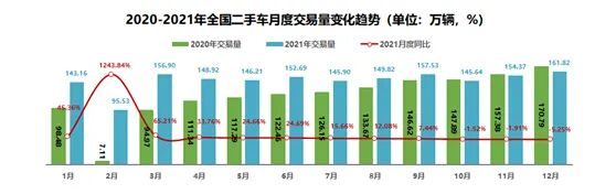 从二手车消费规律来看,临近年末购车需求增加,12月普遍为全年二手车交易的最高点。2021年12月,全国二手车共交易161.82万辆,交易量环比增长4.83%,同比下降5.25%,交易金额为1161.86亿元。