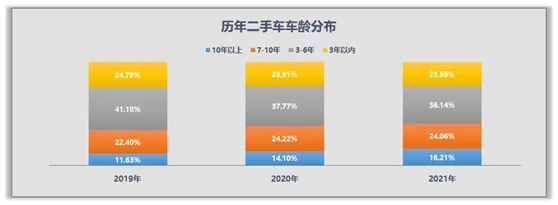 随着保有量的增长,长车龄的二手车源也逐年增长,2021年车龄在10年以上的车型占比与去年同期相比增长了2.11个百分点,共实现了285.05万辆的交易,交易量同比增长29.1%。