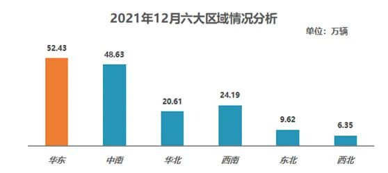 2021年12月,全国六大区交易量环比均出现不同程度的增长。其中华北地区增长最为明显,环比增长9.63个百分点,二手车交易量为20.61万辆;其次是东北地区环比增长8.08%,共交易了9.62万辆;西南地区环比增长7.39%,共交易24.19万辆;中南、华东和西北三个地区增幅较小,环比分别增长了3.77%、2.64%和2.33%,分别交易了48.63万辆、52.43万辆和6.35万辆。