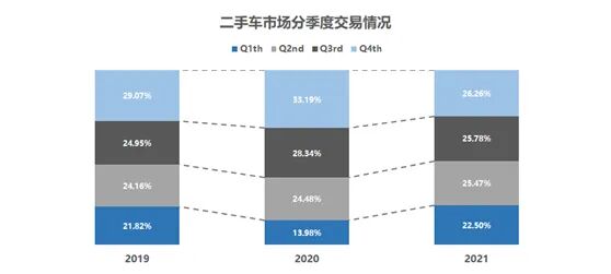 总体来看,2021年一季度受春节长假等因素影响交易量占比最小。第二三季度二手交易较为平稳,占比基本持平。第四季度,受疫情散发等不利因素影响,二手车交易量占比与前两年相比出现明显回落,但仍为全年的高点。