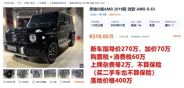比如我们在某知名汽车网站看到二手车价格,一台1年2万公里不到的奔驰G63AMG,新车厂家指导价270万,二手车居然要319万,比新车”贵“49万!