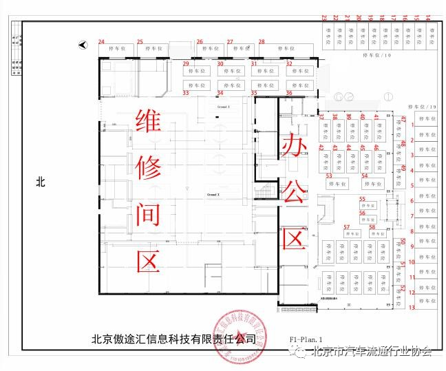 画出二手车周转停车区域、显示车位编号、企业名称盖公章、标注总车位数量的平面布局图;