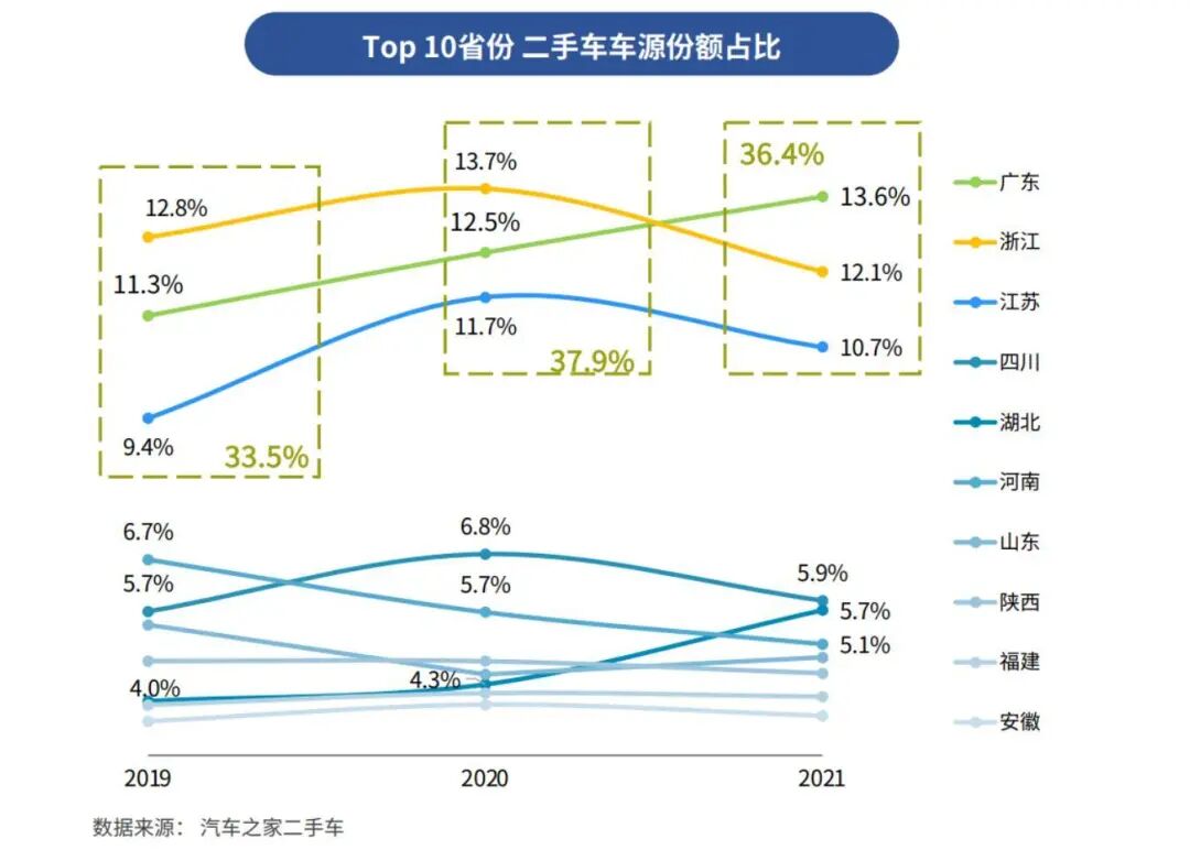 《报告》显示,2021年二手车交易量排名前10的省市占全国二手车总体交易量的70.5%。广东、浙江、江苏三省分列前三,占比依次为13.6%、12.1%、10.7%。