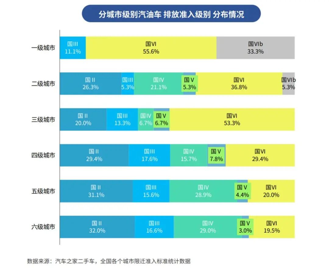 同时,环保准入对全国各区域二手车产生较大影响。目前来看,一线城市二手汽油车限迁门槛最高。虽然三线城市的综合购买力不及二线城市,但53.3%的城市要求二手车应符合“国六”排放标准。