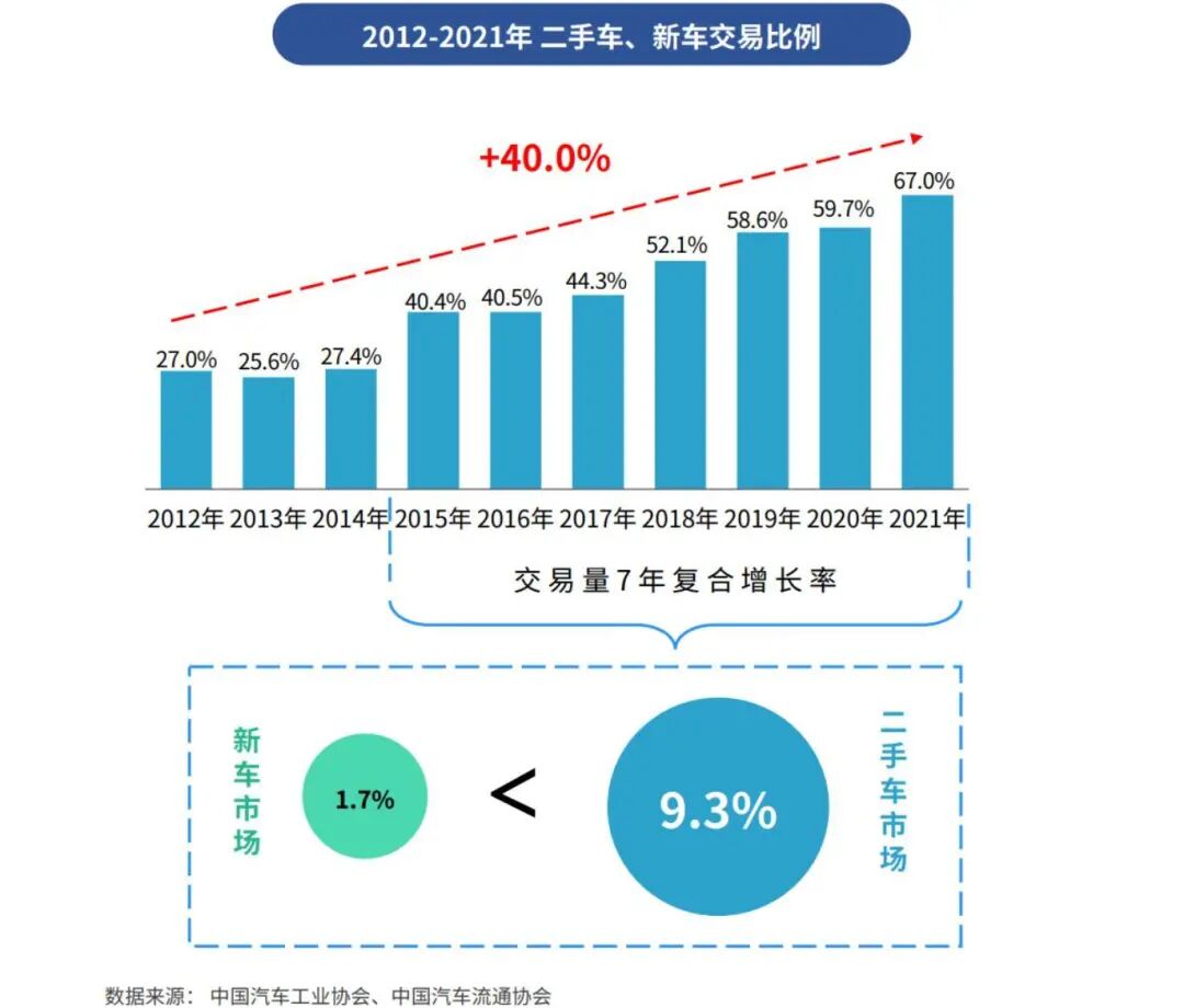 对比新车市场而言,2015年-2021年这七年间,二手车交易量复合增长率约为9.3%,高出新车市场5倍之多。