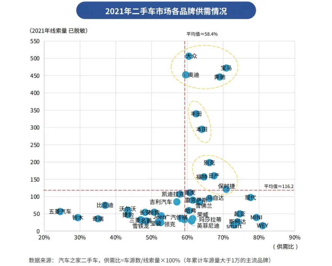 2021年,大众品牌依靠业内较高的市场占有率,二手车交易线索量排名第一。