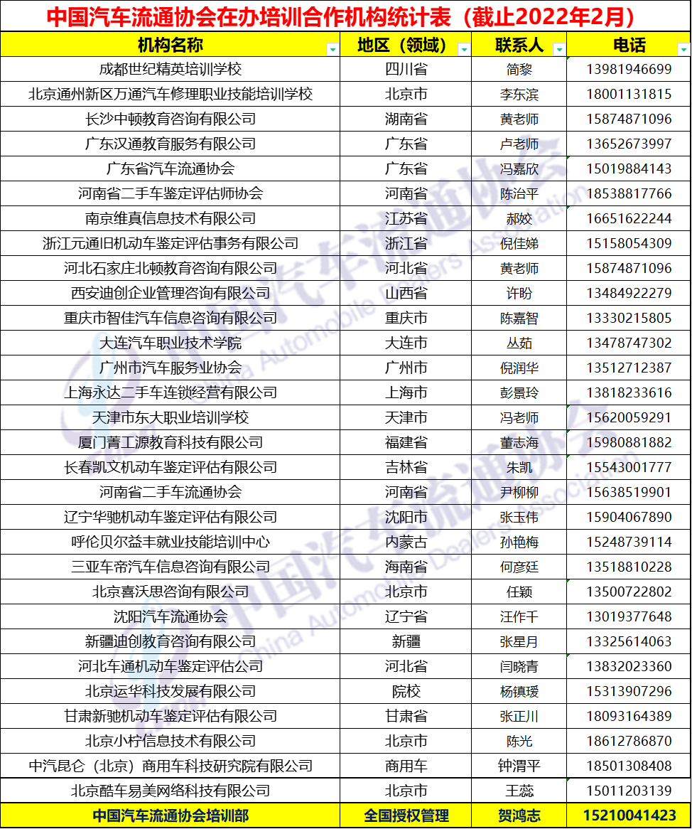 由于目前二手车评估师等培训机构“鱼龙混杂”,也有大量的“卖假证”的人借此机会乱来,因此特别征询了中国汽车流通协会有关部门,提供了其推荐备案的正规培训机构,仅供各位参考,具体请自行联系判断。