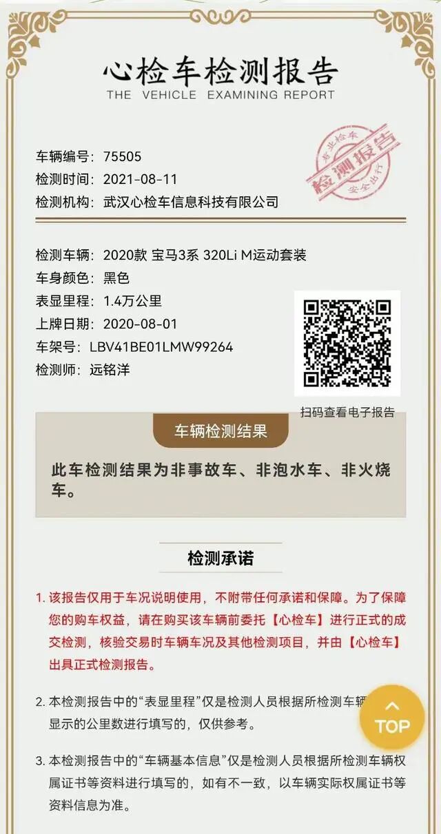 西安中升之宝宝马的工作人员向记者还原了事情的过程。“2021年8月,我们的二手车销售业务经理去武汉收车,因为个人的经验有限,所以当时还找了‘武汉心检车信息科技有限公司’也就是一个第三方机构做检测,检测机构也给出了无事故、无泡水、无火烧的结论。