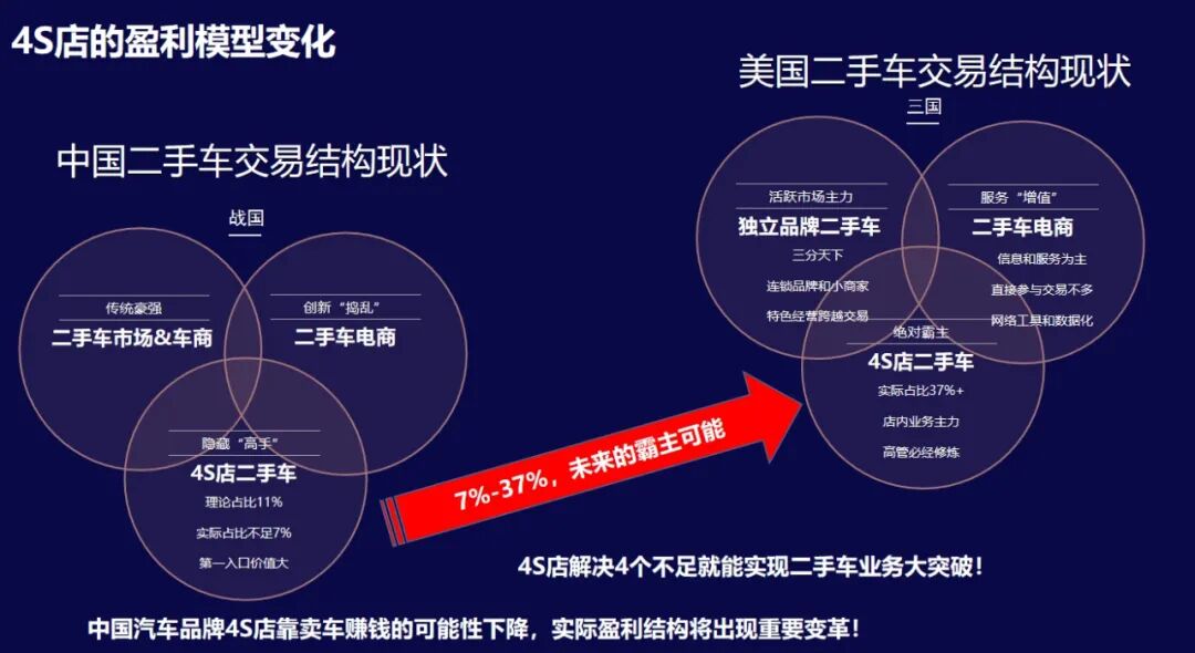 从不完全统计数据看,2017年至今,中国的二手车夫妻老婆店占比由原来的88%下降到65%,一部分实现升级,一部分被行业淘汰;4S店二手车实际零售业务市场占比从不足4%上升至10%左右;机构车源市场占比从不足3.5%上升至8%左右,短短三年时间,市场已经开始质变。