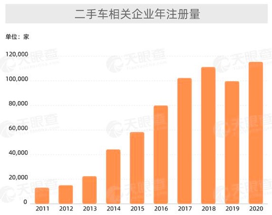 以工商登记为准,2020年我国新增11.5万家二手车相关企业,同比2019年上涨16%。而反观2020年中国二手车交易量则是下降4%。