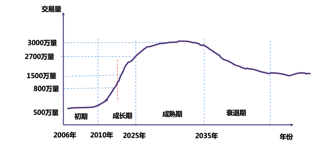 随着汽车保有量逐步增加、二手车交易环境、政策的完善,消费者对于二手车的接受度将大幅度提升,二手车的年交易量也有望超过新车交易量,所以中国的二手车发展空间巨大,行业前景也非常具有想象力。下图是个人对二手车交易量的增长预测,仅代表个人观点。
