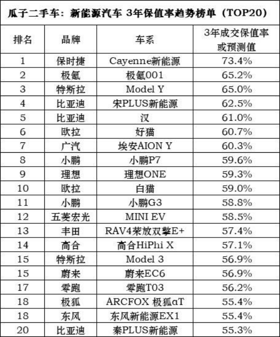 瓜子二手车交易大数据还显示,在该榜单中,保值率最高的车系是保时捷Cayenne新能源汽车,3年保值率为73.4%。