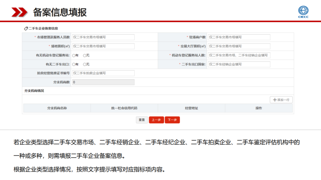 若企业类型选择二手车交易市场、二手车经销企业、二手车经纪企业、二手车拍卖企业、二手车鉴定评估机构中的一种或多种,则需填报二手车企业备案信息。
