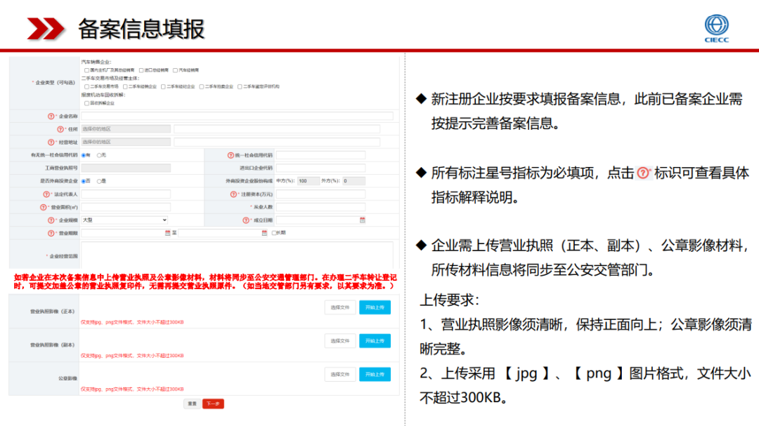 如若企业在本次备案信息中上传营业执照及公章影像材料,材料将同步至公安交通管理部门。在办理二手车转让登记时,可提交加盖公章的营业执照复印件,无需再提交营业执照原件。(如当地交管部门另有要求,以其要求为准)