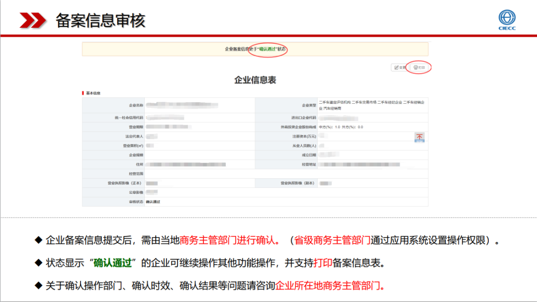 状态显示“确认通过”的企业可继续操作其他功能操作,并支持打印备案信息表。