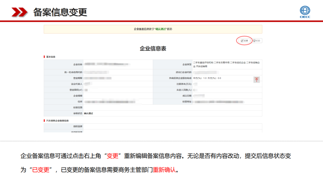 企业备案信息可通过点击右上角“变更”重新编辑备案信息内容。无论是否有内容改动,提交后信息状态变 为“已变更”,已变更的备案信息需要商务主管部门重新确认。