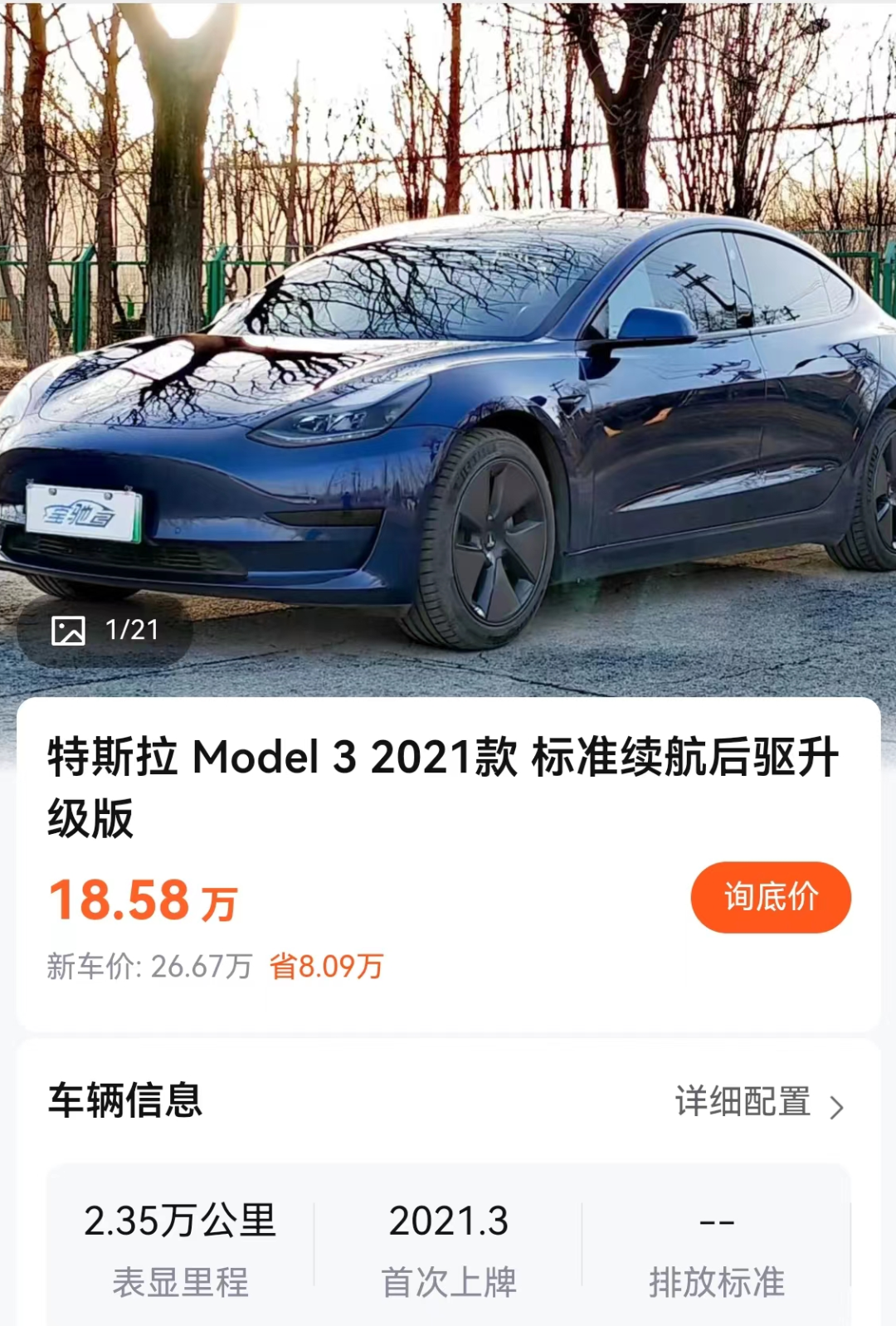 标准续航版特斯拉Model 3,2年前购买落地不低于28万,如今新车22.99万元,新车降价5年,二手车理论折旧6万,现在也就是18万多的行情。