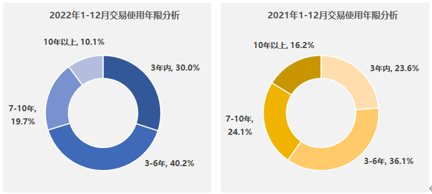 2022年,二手车使用年限在3-6年的交易量最多,占比40.2%,较去年同期增加了6.4个百分点;使用年限在3年内车型占比为30.0%,较去年同期增加了6.4个百分点;车龄在7-10年的车型占19.7%,较去年同期减少了4.4个百分点;车龄10年以上的车型占比为10.1%,较去年同期减少了6.1个百分点。