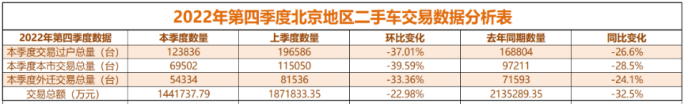 二、受新冠疫情波动频发、消费需求收缩、新车市场传递压制等综合因素影响。2022年北京地区二手车四项主要指标下滑明显,市场表现不尽人意。