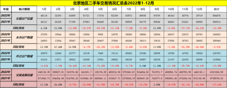 1、2022年北京二手车过户交易总量584876辆,同比去年696914辆累计增长-16.08%。