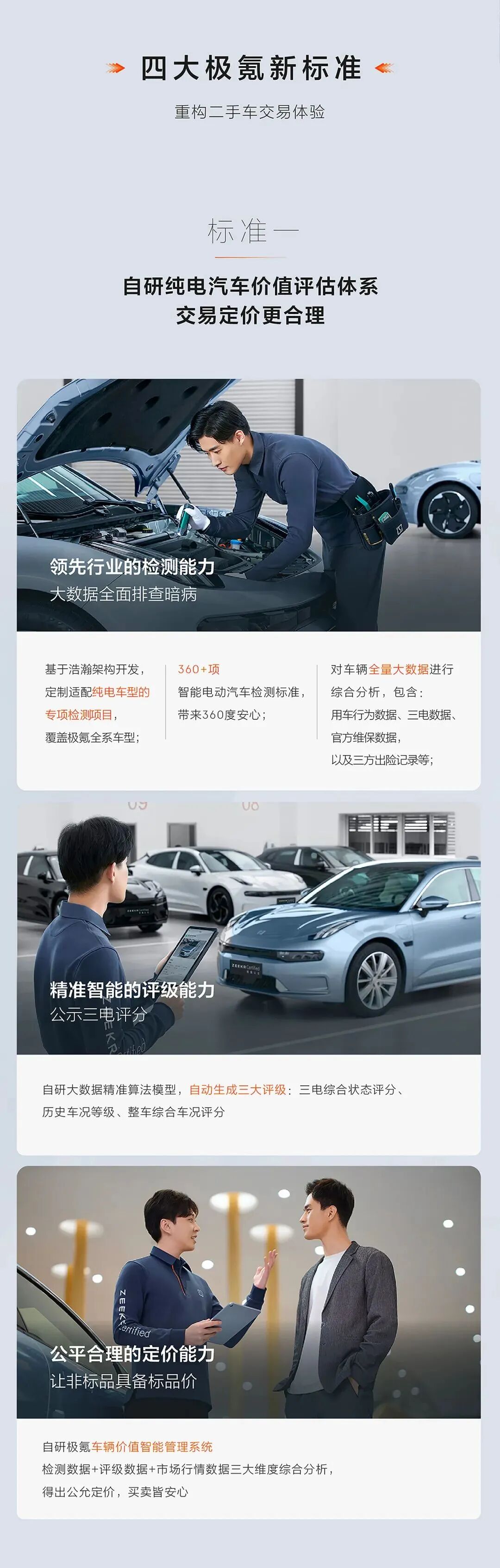 而极氪认证的推出,重构了二手车行业交易体验,其的最大优势在于定向自研的智能检测评估体系,可实现新能源二手车检测、评级、定价一体化。