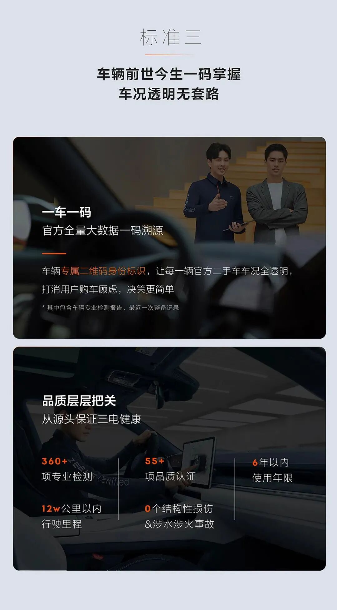 为杜绝问题车,极氪认证从源头严苛准入标准,只收6年内或12万公里内、0结构损伤、0涉水涉火事故的车辆,通过360多项专业检测、55项品质认证,让用户买得放心、用得舒心。